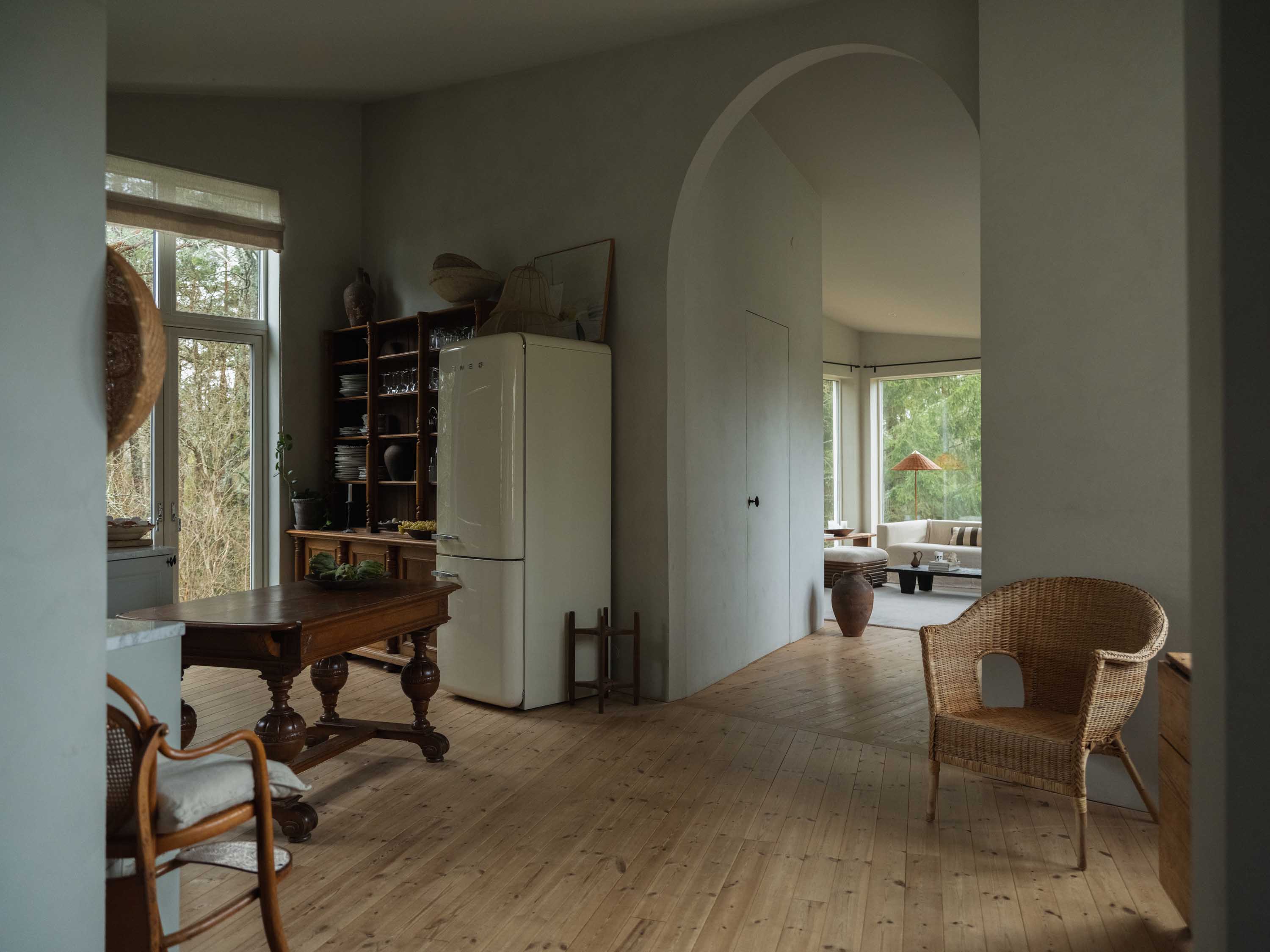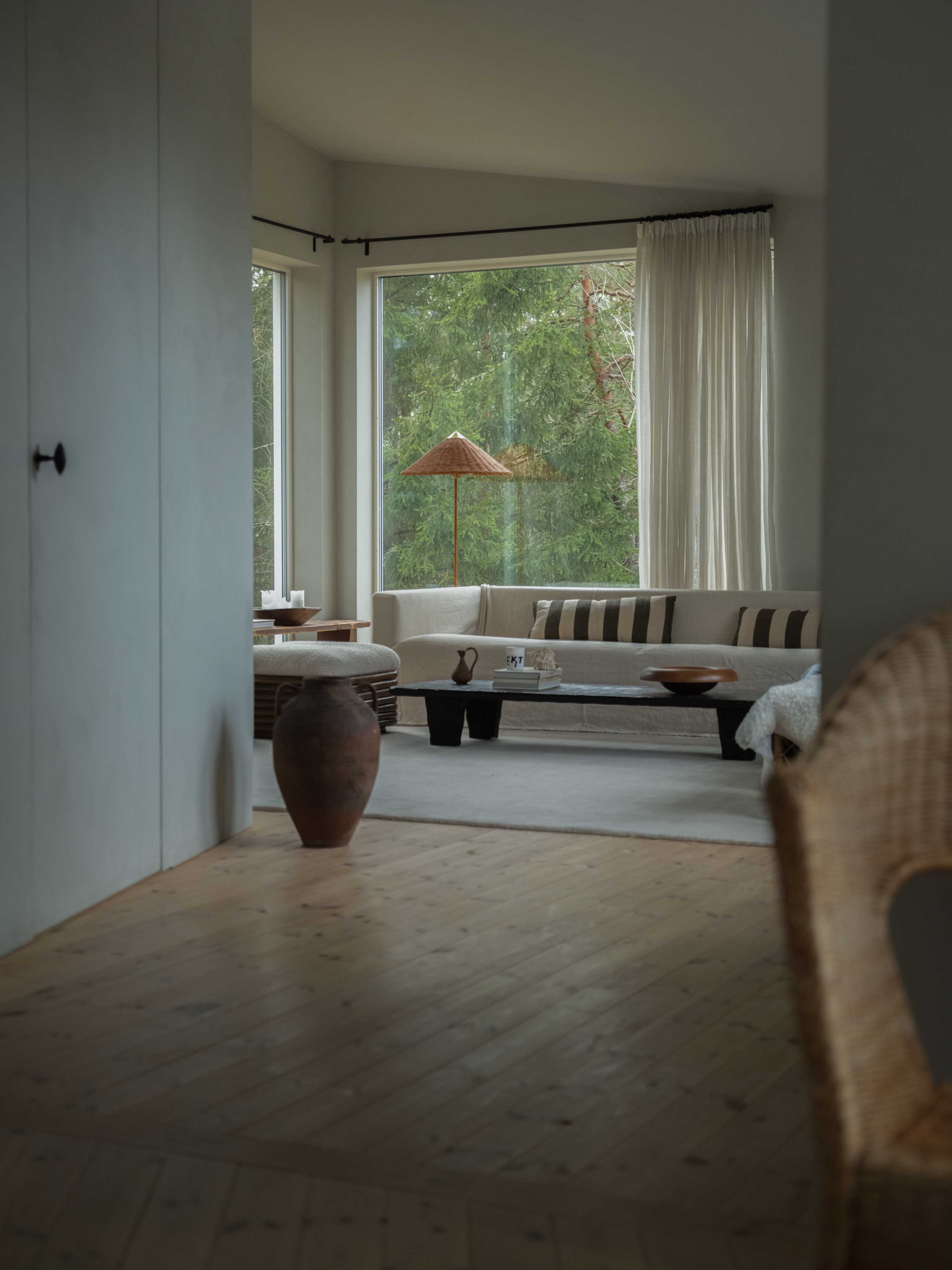 Här möts värme och personlig stil i ett luftigt villahem strax utanför Södertälje. Huset ligger precis där tomten möter skog och ger en känsla av lugn. Köket är hemmets hjärta, med öppna ytor som håller familjen nära varandra. Här blandas ny och gammal design, trägolv möter putsade väggar och mjuka textilier skapar en hemtrevlig atmosfär.