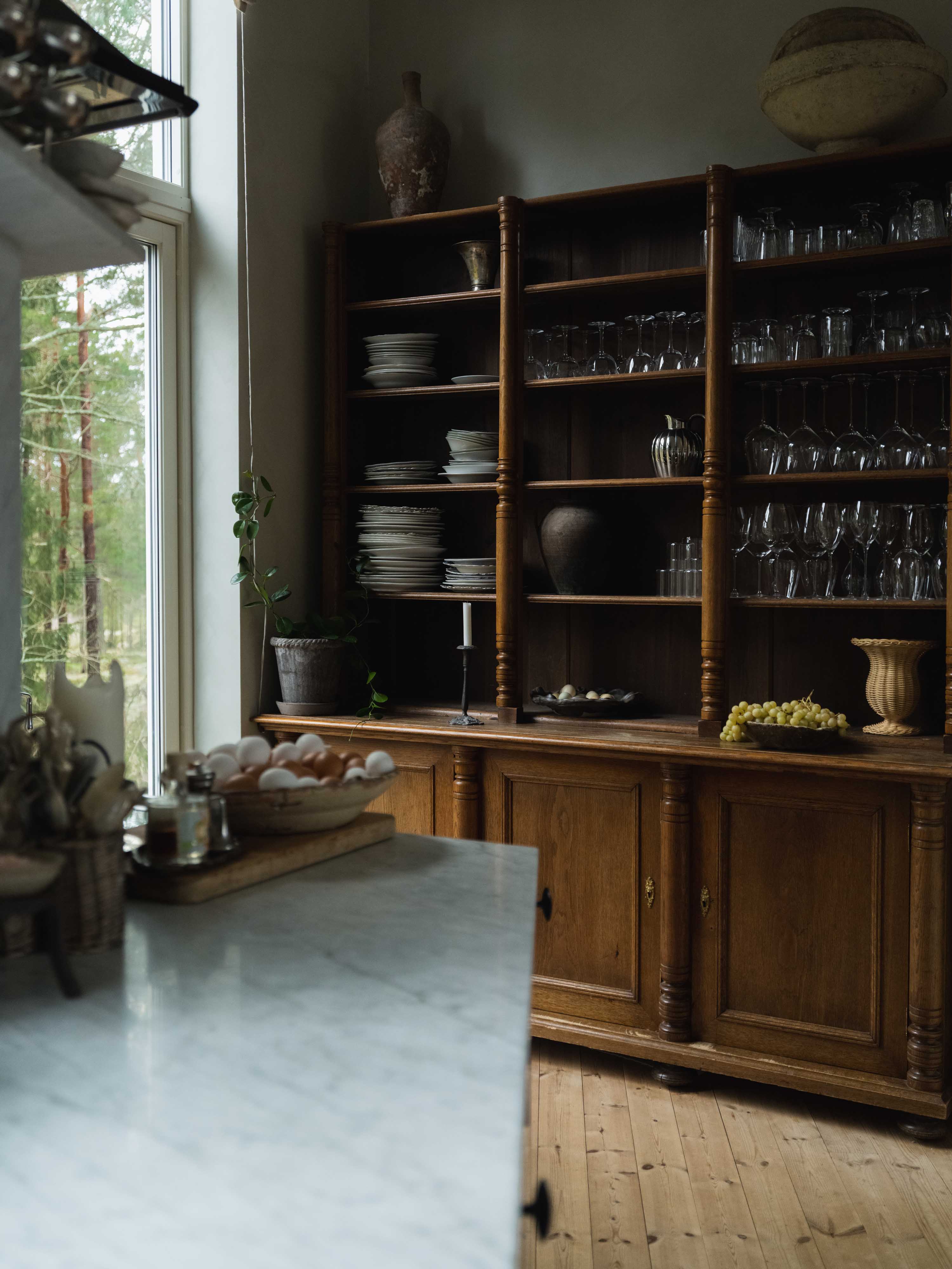 Min favoritgrej i huset är helt klart hyllan i köket. och den har faktiskt en rolig historia bakom sig. När vi byggt klart hela köket hade vi ett stort platsbyggt skåp med både förvaring och kyl, ett omfattande och kostsamt bygge. Sedan skickade en kompis en länk till en hylla på Blocket, och jag kände bara att jag måste ha den. Den fanns dessutom att hämta i Södertälje, som om det var menat! Problemet var bara hur jag skulle lösa det, både med nedmontering av det gamla och transporten av den nya hyllan. Så jag fick ragga lite folk som kunde hjälpa till, och gjorde det hela lite i smyg. Min kille var kanske inte jätteglad först, med tanke på all tid vi lagt på köket, men idag är han otroligt tacksam. Jag har nog gjort många tokiga saker för att vi ska hamna där vi är nu.